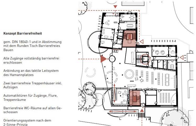 Prägend für das Gebäude ist zudem die Verbindung zu dem zukünftig neu gestalteten Hamannplatz. Die großflächige Verglasung des Erdgeschossbereiches im Westen und Süden bietet eine unmittelbare Sichtbeziehung zwischen dem Hamannplatz und dem Stadtteilhaus, gleichzeitig entsteht durch die sichtbare Fortführung der Gestaltungselemente des Platzes in das Gebäude hinein eine Art überdachter Übergangsraum, der neugierig macht und zum Erkunden einlädt.