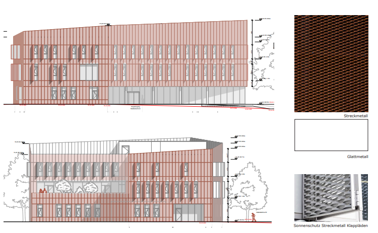 Die Streckmetall-Fassade des Gebäudes aus recyceltem Aluminium und passt sich durch seine Farbgebung optisch an die Gebäude im näheren Umfeld an.