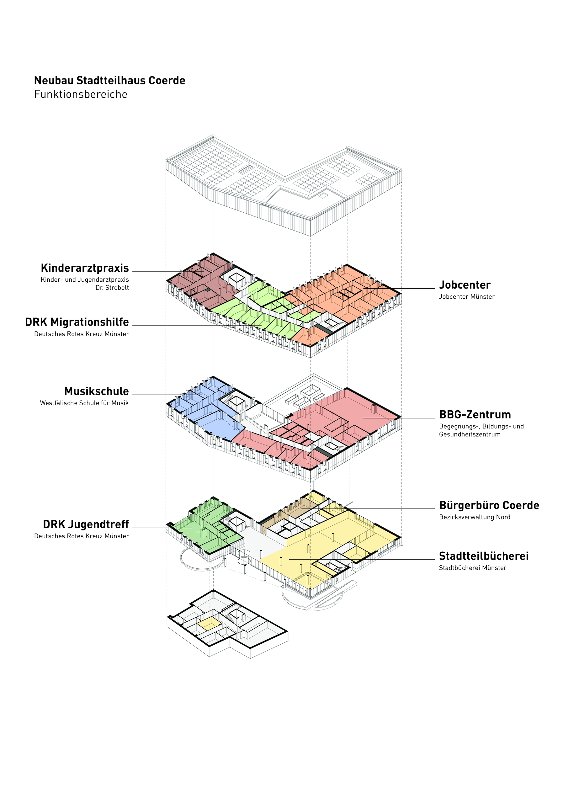 Der Neubau des Hauses schafft in zentraler, gut erreichbarer Lage eine niedrigschwellige Anlaufstelle für Bildungs-, Begegnungs-, Beratungs- und Gesundheitsangebote für alle Bewohnerinnen und Bewohner von Coerde. Dabei bündelt die neue Einrichtung die bislang im Stadtteil verstreuten Angebote unter einem Dach. Die dadurch entstehende räumliche Nähe der Angebote leistet zudem einen wichtigen Beitrag zur Weiterentwicklung der Kooperationsmöglichkeiten der Akteure im Stadtteil.